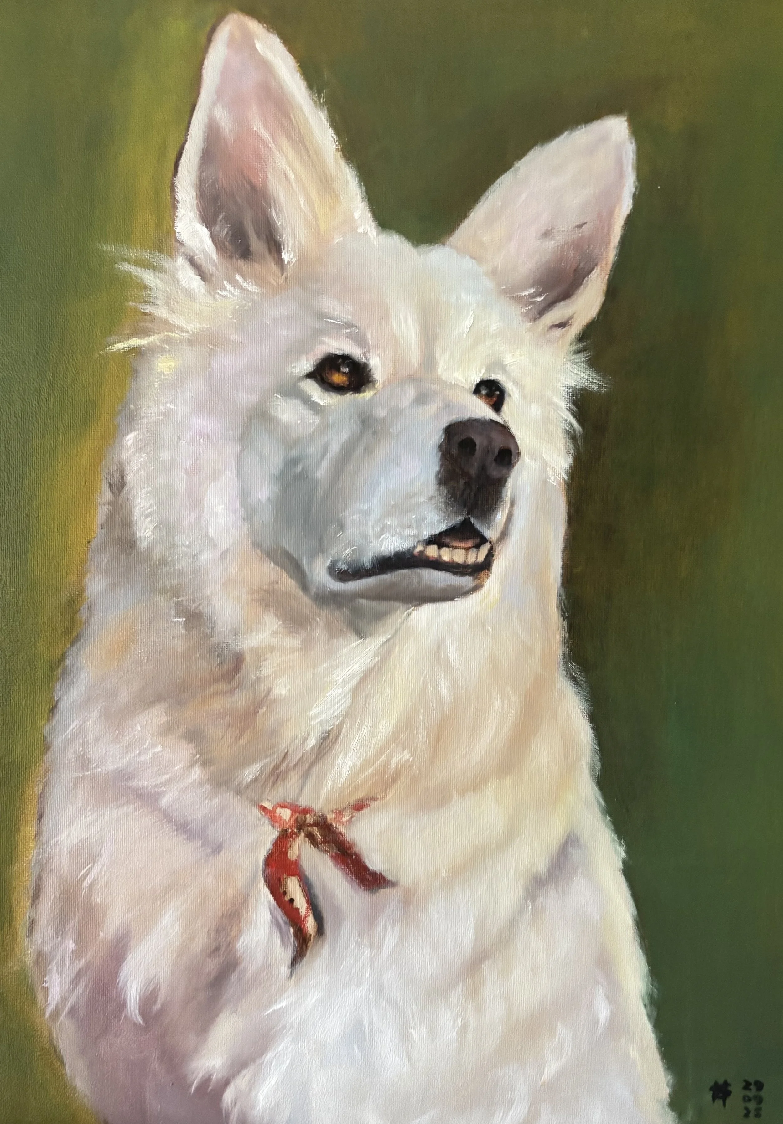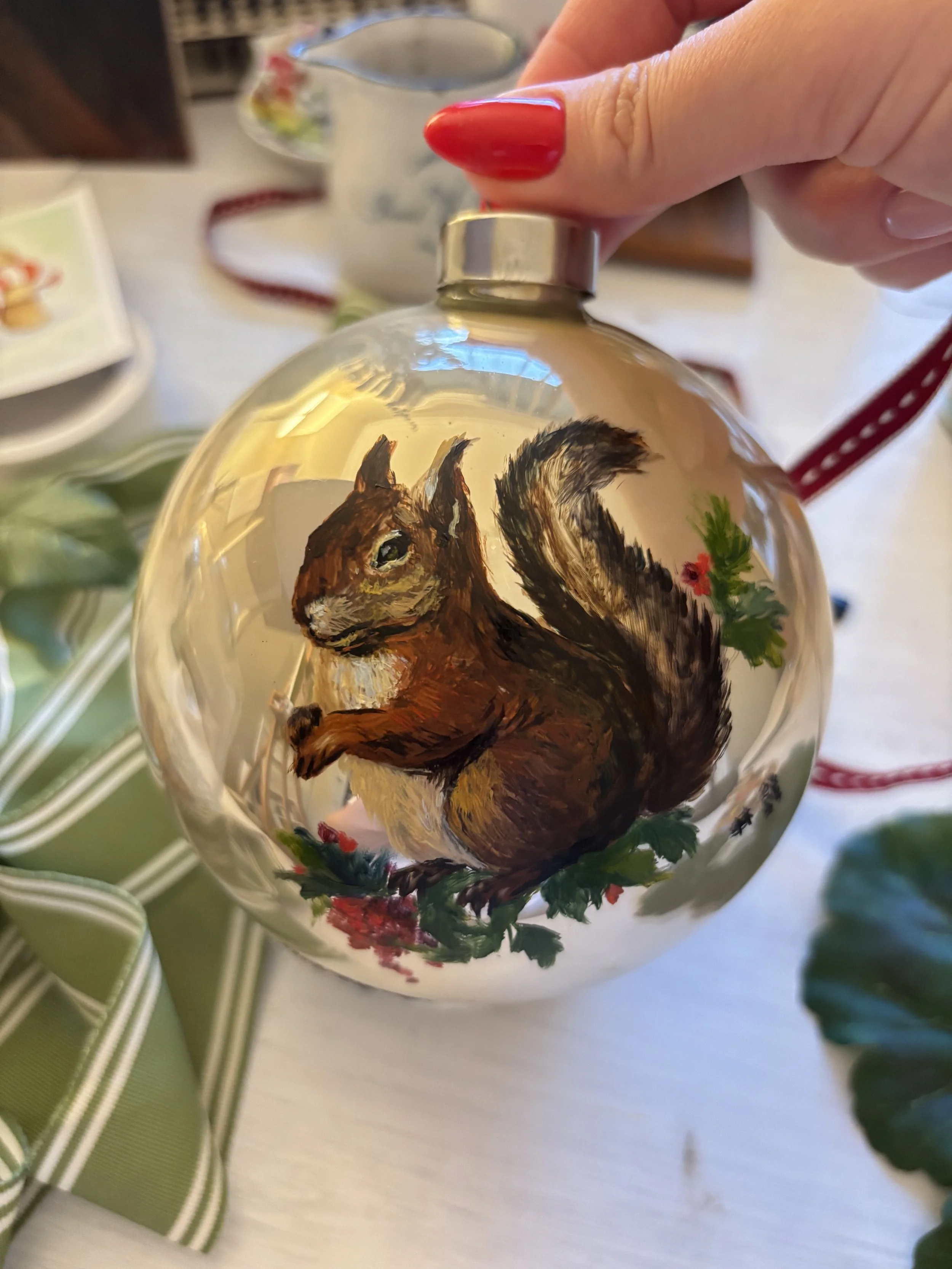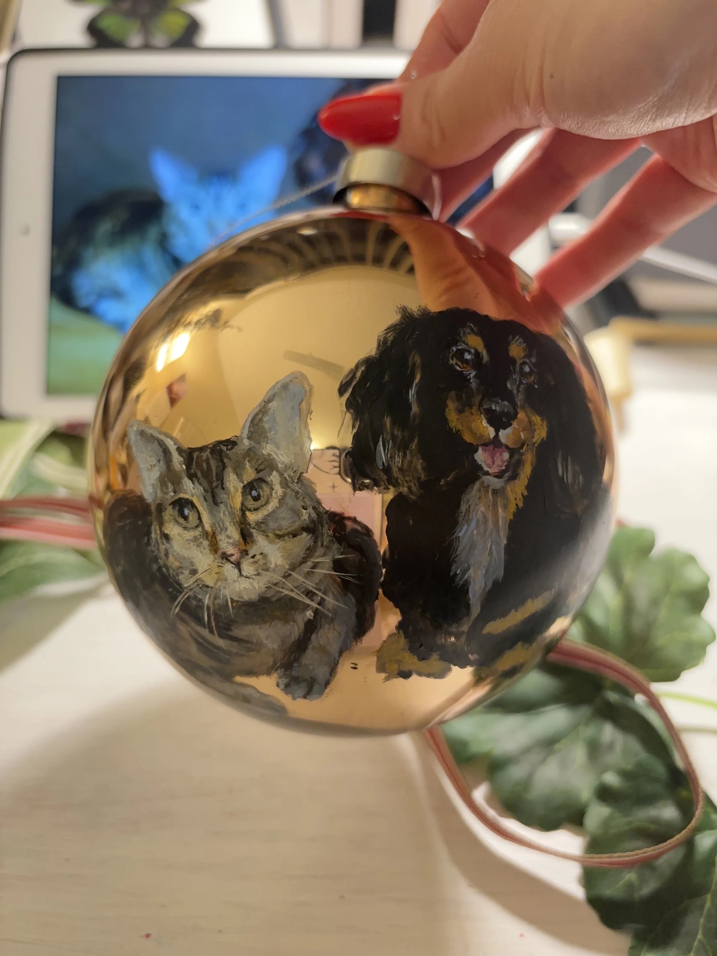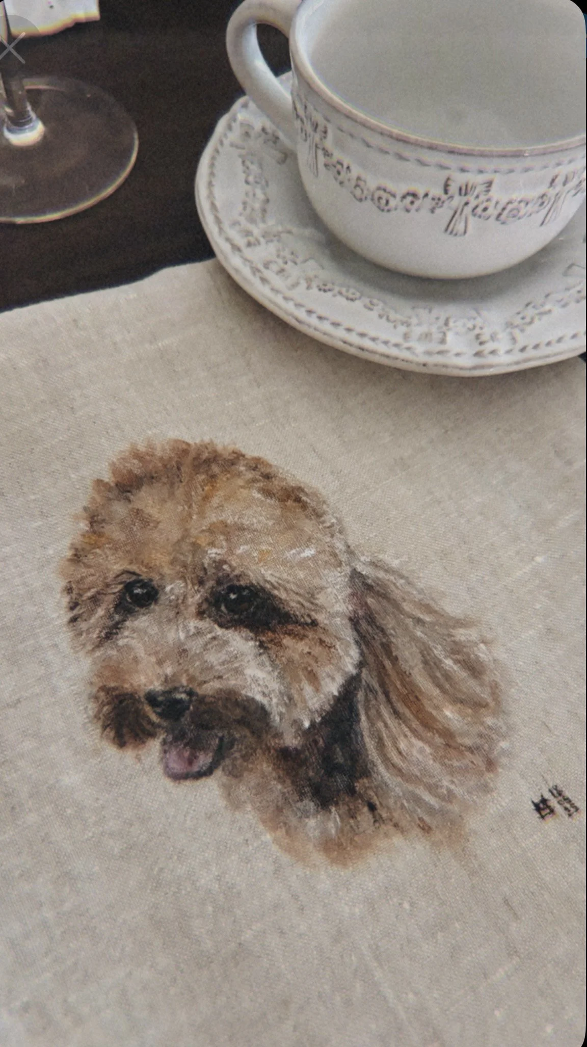 Commission Painting. Frank Portrait. Oil on Canvas Custom Painting on Linen Napkin. Nagget Portrait. Christmas Ornament Custom Painting. Two Furry Friends. Christmas Ornament Painting. Squirrel.